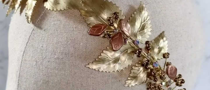 Zimri headband is an exclusive design by Grace De Bloom. Each piece created is carefully handcrafted, with meticulously painstaking attention to small detail, to ensure original and limited one-offs. This beautiful gold flower headband is inspired by garden and nature; made of hand-painted gold color flowers, leaves, bronze color czech glass leaves, and swarovski crystals. Make your wedding day royal with an elegant look.